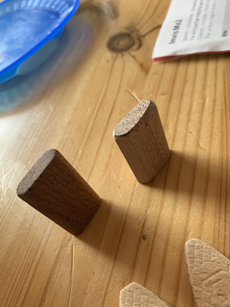 Je maakt in beide delen overeenkomstig gat, hier doe je lijm in. In 1 kant voeg je de domino toe en daarna verbind je het overige stuk.